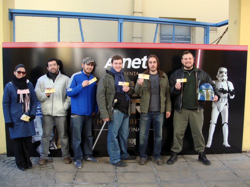 Los integrantes de los grupos locales Star Wars Fan Club Argentina, Rebel Legion, Renegados de la Fuerza y Mandolarian Mercs se caracterizaron para darle mas colorido a la fiesta. Así que tuvimos que llegar una hora antes que todos los demás porque algunos de los disfraces necesitan más tiempo que otros, especialmente los de armadura. Como podrán apreciar tuvimos tiempo de sacarnos fotos de civil con el decorado de la exposición. Cada uno mostrando su correspondiente entrada. Eso sí, todos ordenaditos de menor a mayor, como en la escuela.