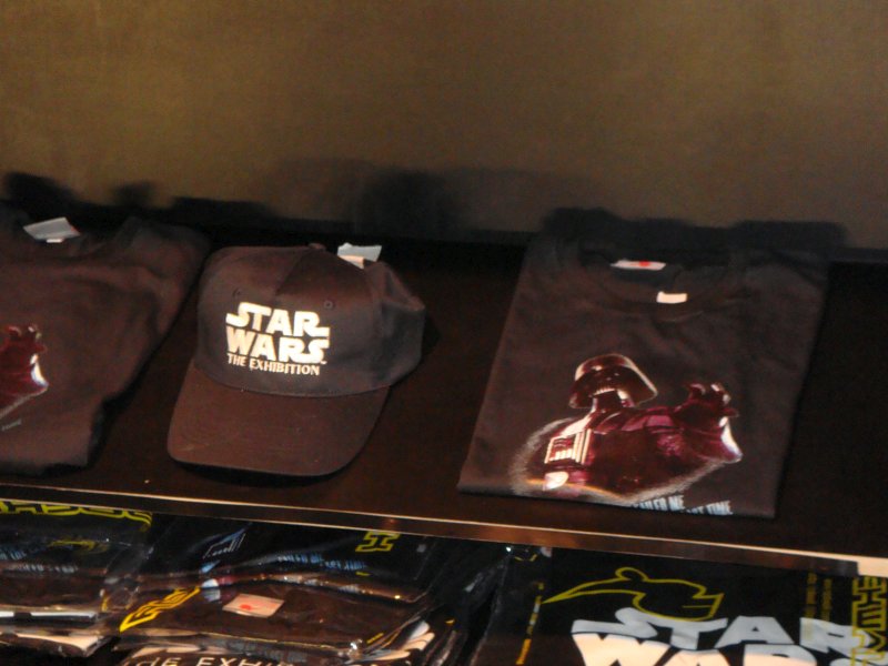 Una vez adentro, seguimos saludando fanáticos, tomándonos fotos y promoviendo las actividades del Star Wars Fan Club Argentina. Aprovechamos para sacarnos una foto grupal, entre los miembros que asistieron al evento. Todo en un clima camaradería. Lo hicimos en la sala de armas de la exposición, donde luego de un rato, se conglomeró el grueso de la gente que visitaba la muestra. Se podían escuchar diferentes acentos entre los visitantes. Muchos fanáticos habían viajado de muy lejos solo para visitar la exposición. ¡Que honor! Pude escaparme un ratito para visitar la tienda de merchandising oficial de la muestra. El día anterior llegaron todos los ítems que aparecen en las siguientes fotos. Una gorra, dos remeras, una taza, un pad para el Mouse y un pequeño catálogo de la exposición. Los precios van desde los 16 a los 45 pesos Argentinos. También venden figuras de acción y sables de luz de juguete.